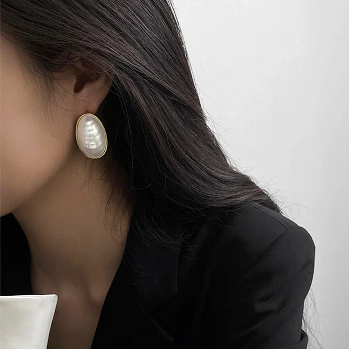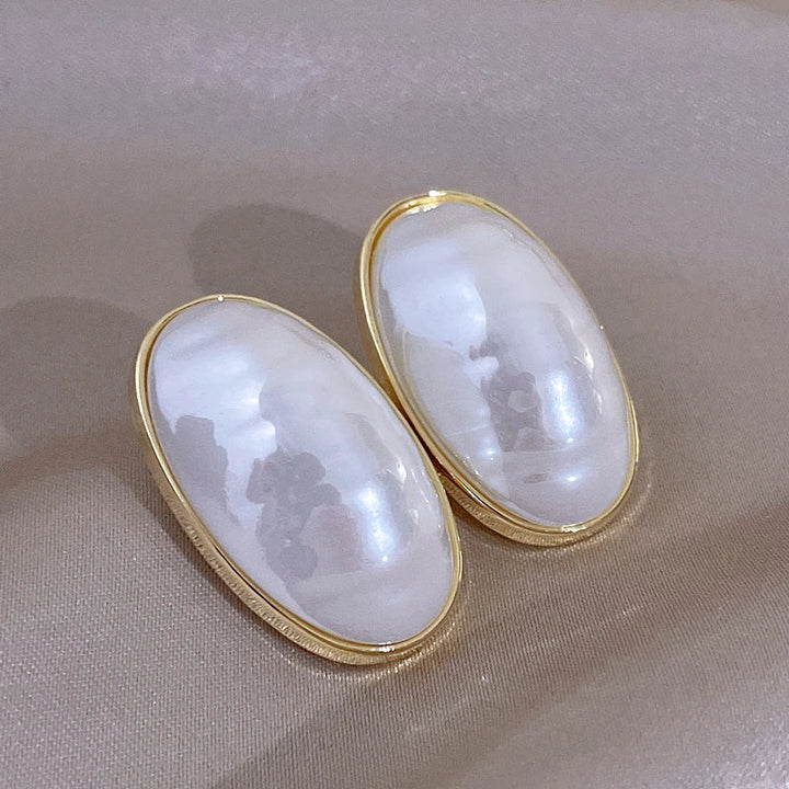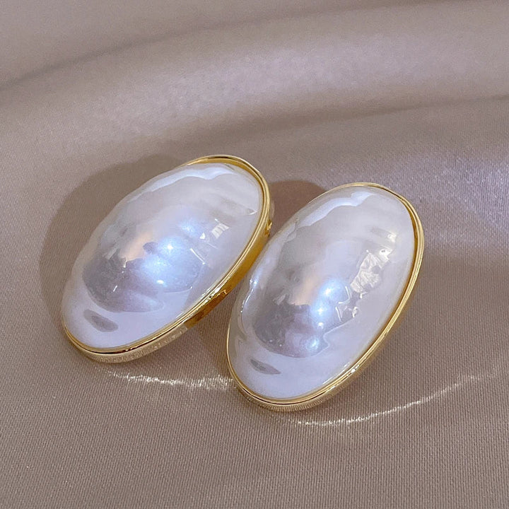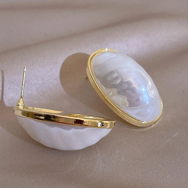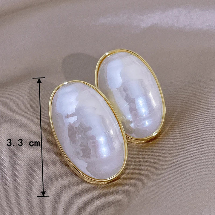 The gala’s buzzing, chandeliers dripping gold, and you smooth your dress—these big pearl stud earrings sit like twin moons on your lobes, copper backs cradling oversized simulated pearls that catch every swirl of light in a bold, round glow. A faint clink against your champagne flute, cool metal warming quick. It’s quiet power. Ever think studs could make the whole room orbit you?