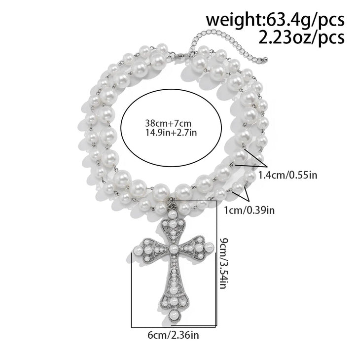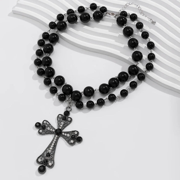 The afterparty’s dim, vinyl spinning slow, and you lean against the wall—this monochrome cross swings on beaded strands, acrylic pearls catching the red glow in stark contrast, iron alloy cool at your throat. A soft clatter when you breathe, like dice in a velvet pouch. It’s duality you can dance with. Ever think a necklace could make the night choose sides?