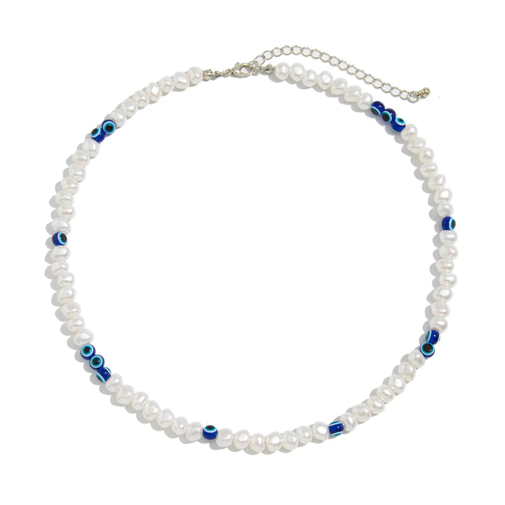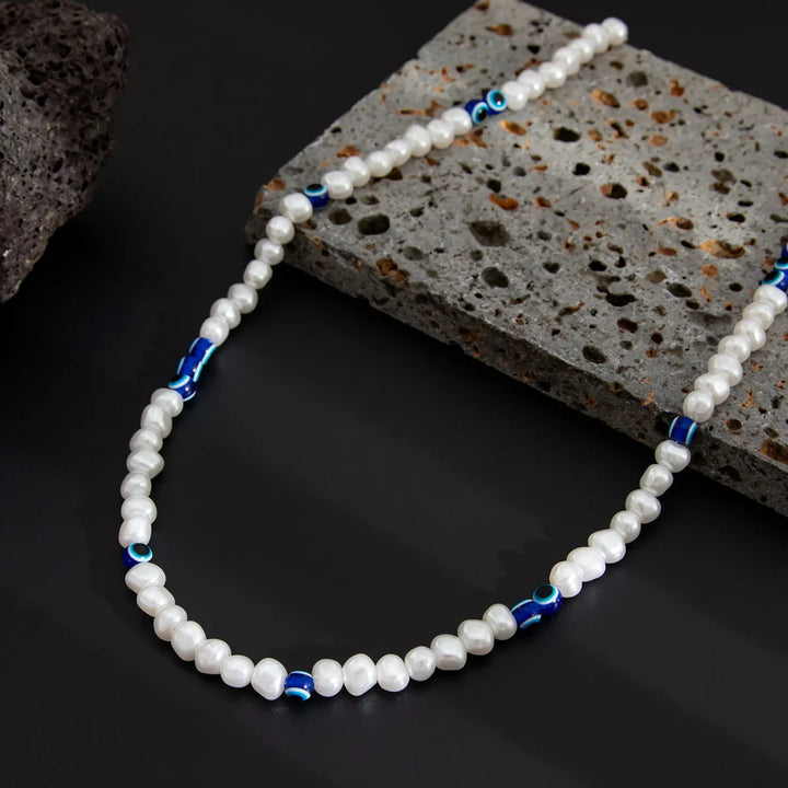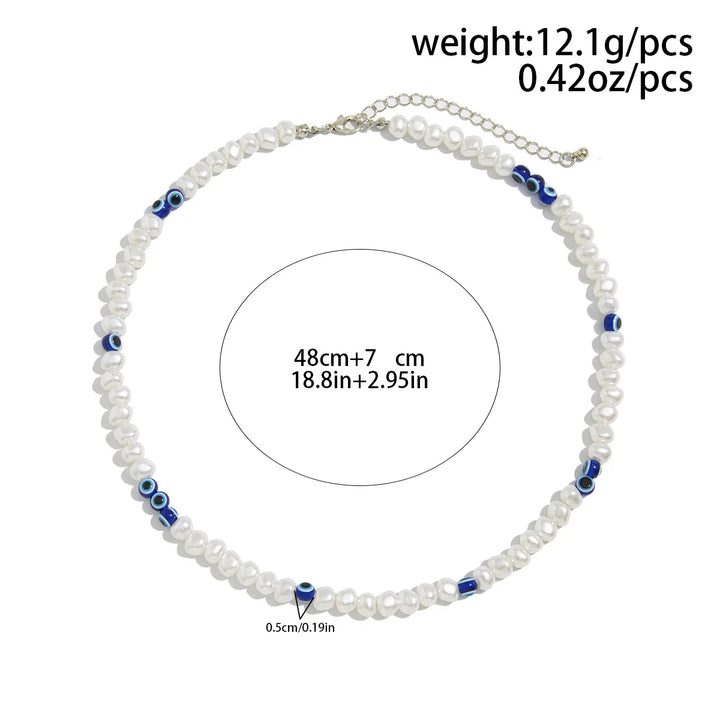 • Blue & white acrylic pearls → Popping orbs glowing like graffiti moonlight, turning glances into grins, draping you in urban radiance. • Hip-hop eye beads → Bold stares that bounce with every move, gifting street swagger. • Zinc alloy links → Tarnish-proof chain in raw silver, promising enduring edge. • Choker silhouette → Breathable fit for tees or tanks, adding versatile cool. • Feather-light build → Barely-there weight for all-night sway, ensuring comfortable vibe.