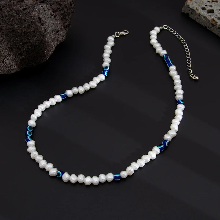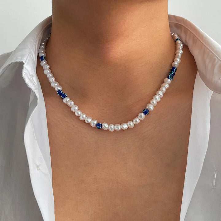 But here’s what still smells like fresh spray paint: late October 2025, our jeweler Beat was tagging the alley when acrylic pearls rolled across the zinc into blue-white chaos—round, luminous, perfect. She strung the choker right there, then spent weeks under neon glow crafting necklaces that almost pulse with the bass. Touch your neck—feel the cool snap, the gentle tug. The blue & white pearl choker necklace isn’t trendy; it’s the moment the lights strobe, the hush before the drop, the vow that retro can roar.