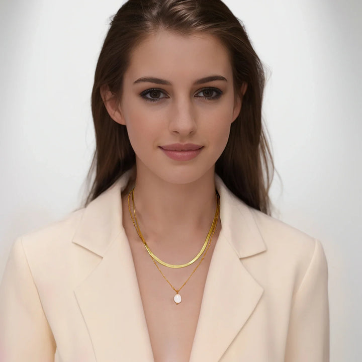 The rooftop’s humming low, city lights pulsing like a slow heartbeat, and you lean back—this chain with pearl pendant slides like liquid gold, PVD-plated stainless steel snake chain slipping to a 9*11mm pearl that catches every neon flicker. A whisper-soft clink when you breathe, cool metal warming quick. It’s everyday magic. Ever think a pendant could make the skyline feel like it’s dancing just for you?