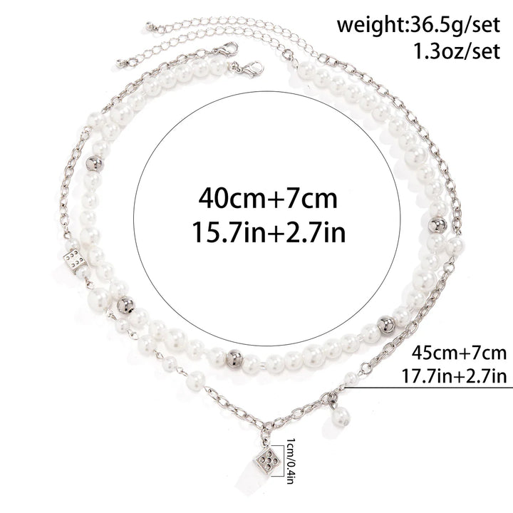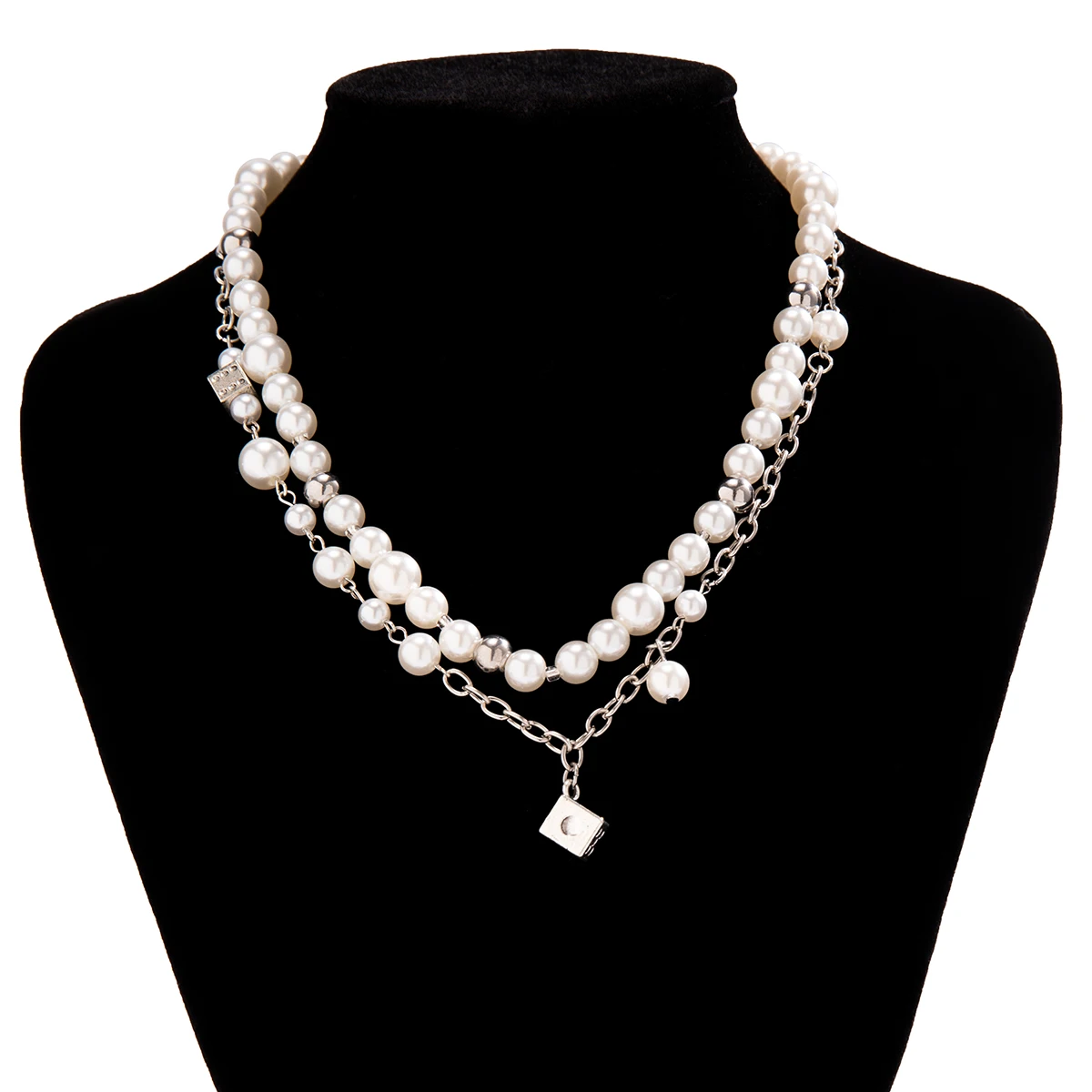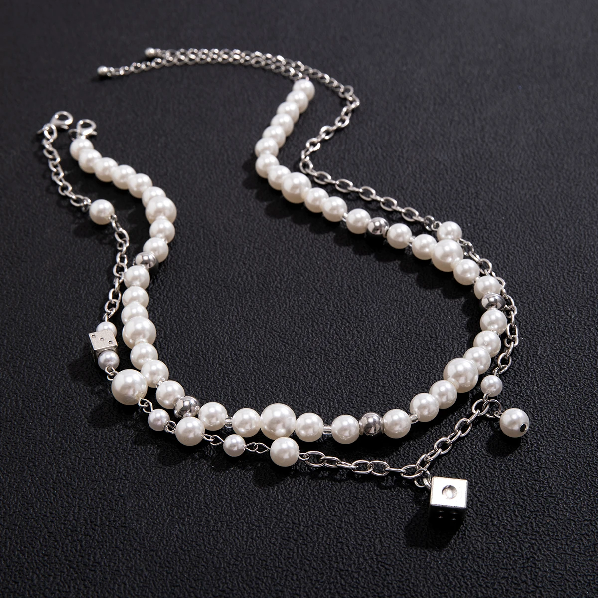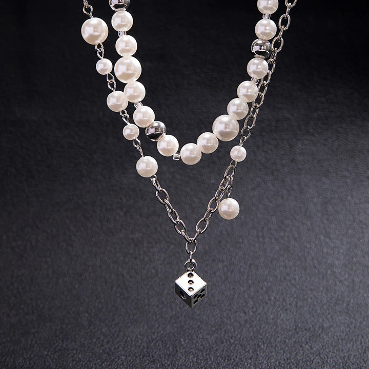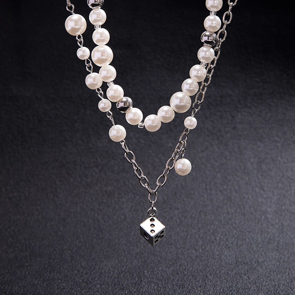 The warehouse party’s thumping, lasers slicing smoke, and you shoulder through—this layered necklace for men stacks like a rebel’s armor, zinc and iron alloy beaded chains tumbling perfectly round simulated pearls in a punk, square-edged choker that catches every strobe. A gritty clink against your chest, cool metal warming fast. It’s power you own. Ever think pearls could make the whole crowd part just for you?