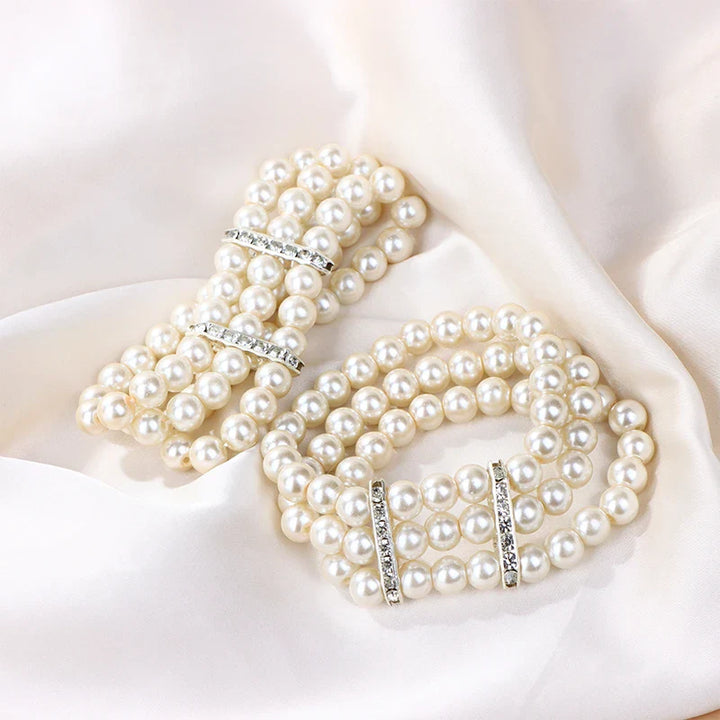 • Three-layer pearl rows → Glass orbs glowing like bottled starlight, turning glances into sighs, draping you in layered radiance. • Elastic stretch fit → Snug yet comfy for any wrist, gifting effortless ease. • 2.5cm stack height → Bold yet soft tiers that move with you, promising dynamic charm. • Glass pearl sheen → Polished glow for day or night, adding versatile luxe. • Feather-light build → Barely-there weight for all-night sway, ensuring comfortable magic.