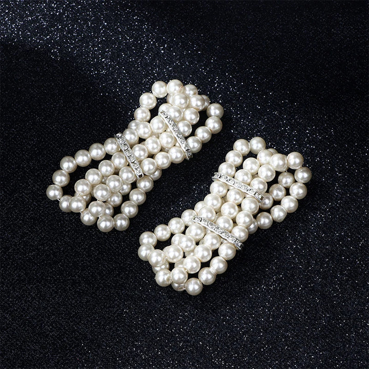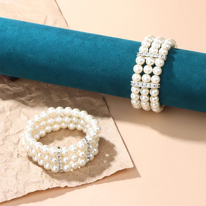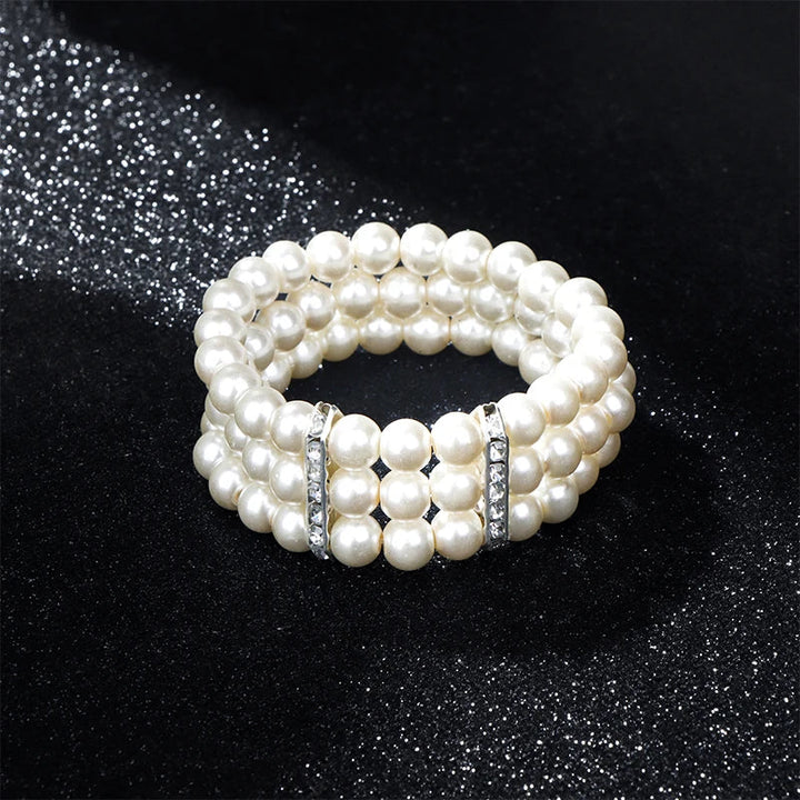 The desert festival’s shimmering at dusk, lanterns swaying in the breeze, and you flick your wrist—this layered pearl bracelet cascades like a mirage, three rows of glass pearls strung on elastic, glowing soft against your skin in a 2.5cm stack that catches every fading ray. A gentle clink with your bangles, cool beads warming fast. It’s magic you wear. Ever think pearls could make the whole twilight feel like it’s swirling you?