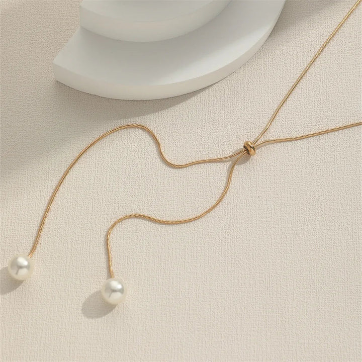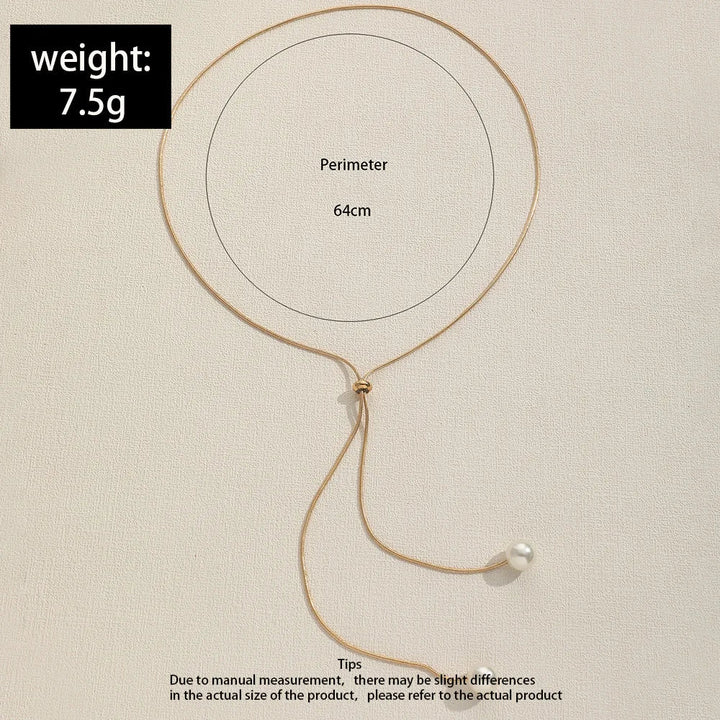 The pier’s quiet now, waves whispering under the boardwalk lights, and you let the breeze lift your hair—this long strand pearl necklace spills like liquid moonlight, tin alloy bamboo chain weaving near-round simulated pearls in an endless flow that brushes your waist. A soft clink against the rail, cool links warming slow. It’s tide you carry. Ever think a strand could make the whole ocean feel like it’s swaying with you?