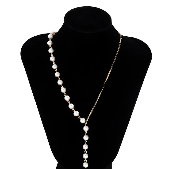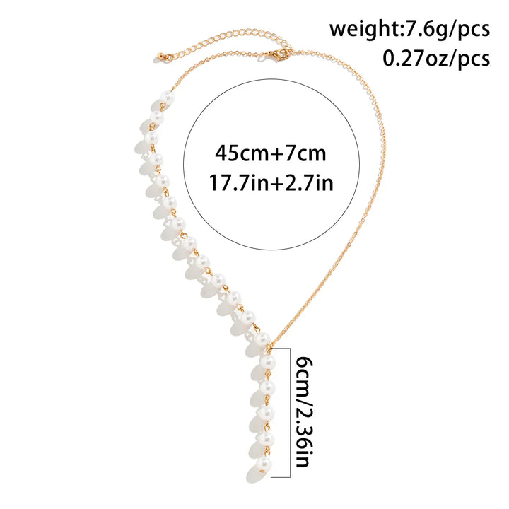 The balcony’s lit by paper lanterns, laughter drifting up from the street, and you tilt your glass—this pearl and chain necklace drapes like a love letter in gold, copper alloy links weaving perfectly round simulated pearls in geometric whispers, each bead catching the glow with a soft clink against your collarbone. Light as a secret, warm as skin. Ever think a pendant could make the night lean in just to listen?