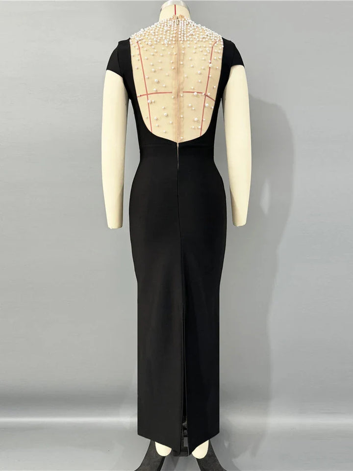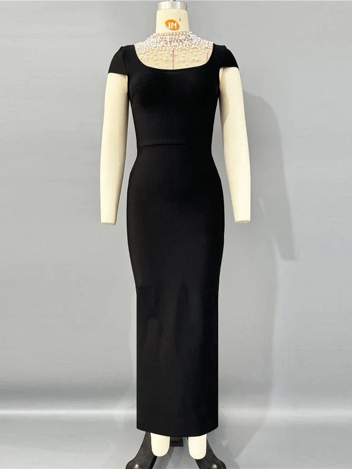 • Intricate pearl beading → Each hand-placed pearl catches light like dewdrops at dawn, giving you that irresistible glow ✨ • Sheath silhouette → Flows along your natural curves, creating that perfect figure-flattering silhouette • Medium-stretch fabric → Moves with you like a second skin, offering both comfort and that perfect body-hugging fit • Ankle-length design → Creates an elegant sweep as you walk, leaving a trail of unforgettable presence • Empire waistline → Accentuates your smallest point, offering that perfect hourglass enhancement • O-neck with short sleeves → Balances the daring silhouette with classic sophistication, offering that perfect blend of sexy and refined