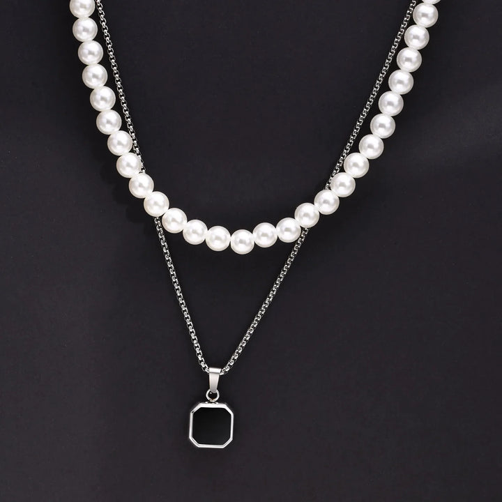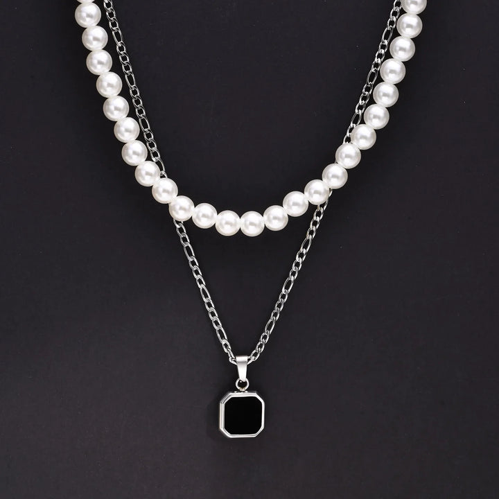 The alley’s pulsing with bass, graffiti glowing under blacklights, and you push through the crowd—this pearl & black pendant hangs like a quiet storm, stainless steel link chain dropping a 15mm geometric pearl against matte black in 45cm or 55cm silver. A low clink when you nod, cool weight settling fast. It’s shadow with soul. Ever think contrast could make the whole night part just for you?