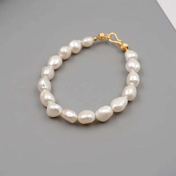 • Irregular freshwater pearls → Wonky orbs glowing like bottled dusk, turning nods into awe, draping you in organic radiance. • Geometric bead flow → Sharp yet soft links that sway with every gesture, gifting trendy motion. • Stainless steel core → Tarnish-proof chain in warm gold, promising enduring grace. • Pearl-clasp closure → Seamless snap for wrists big or small, adding versatile luxe. • Feather-light build → Barely-there weight for all-day sway, ensuring comfortable magic.