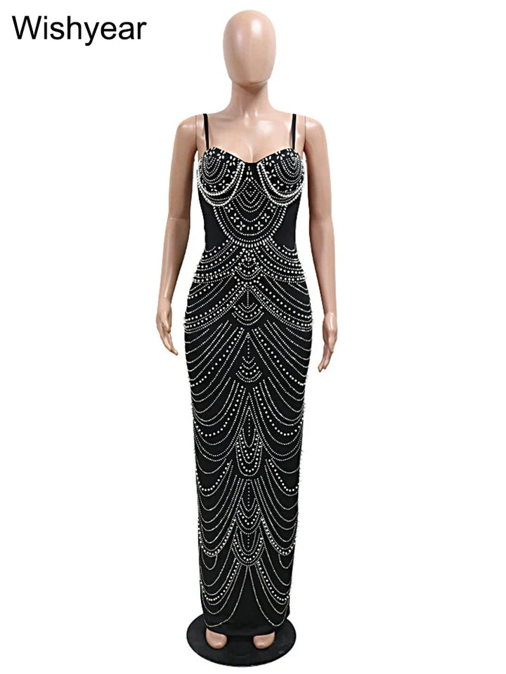 • Exquisite diamond and pearl embellishments → Create a celestial sparkle that catches light from every angle, giving you that irresistible glow • Elegant V-neckline with spaghetti straps → Frames your shoulders and collarbones with delicate sophistication, offering you timeless allure • Floor-length pencil silhouette → Creates a statuesque figure that elongates your form, providing that red-carpet presence • Empire waistline → Accentuates your natural shape without constricting, giving you that perfect celebrity silhouette • Medium stretch mesh fabric → Moves with your body like liquid starlight, ensuring all-night comfort without sacrificing style • Versatile all-season design → Transitions seamlessly from summer galas to winter events, giving you year-round elegance