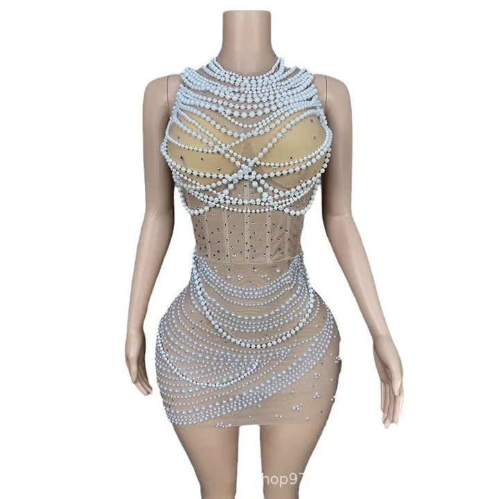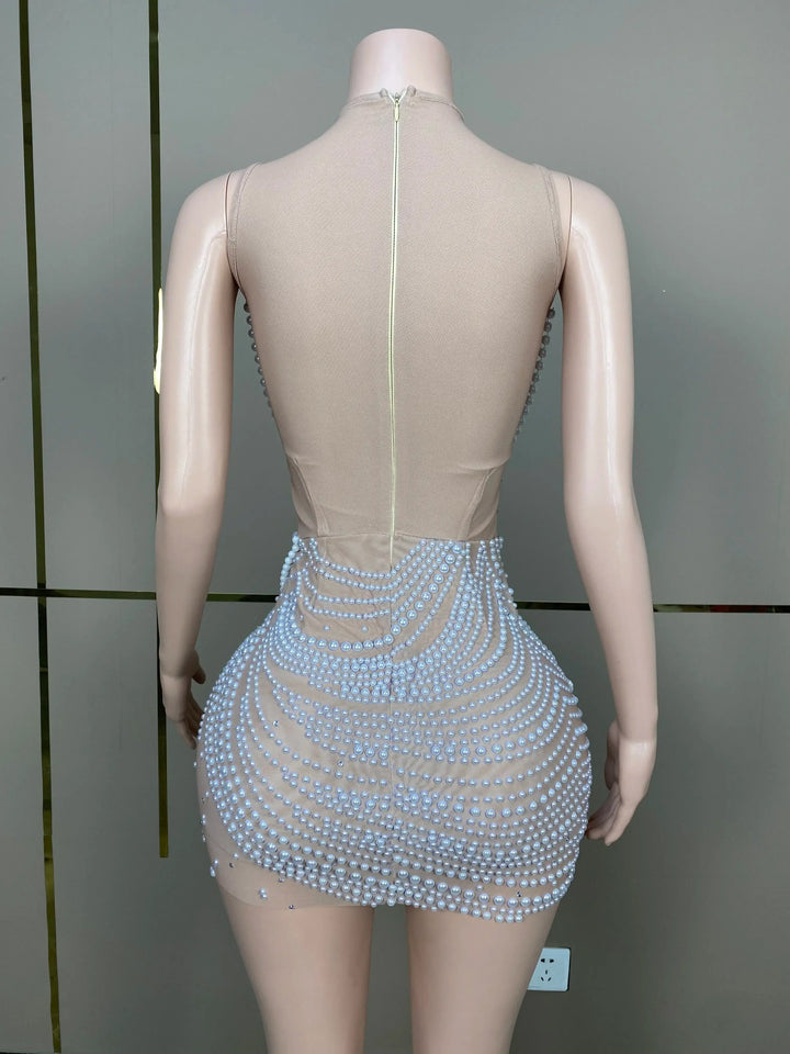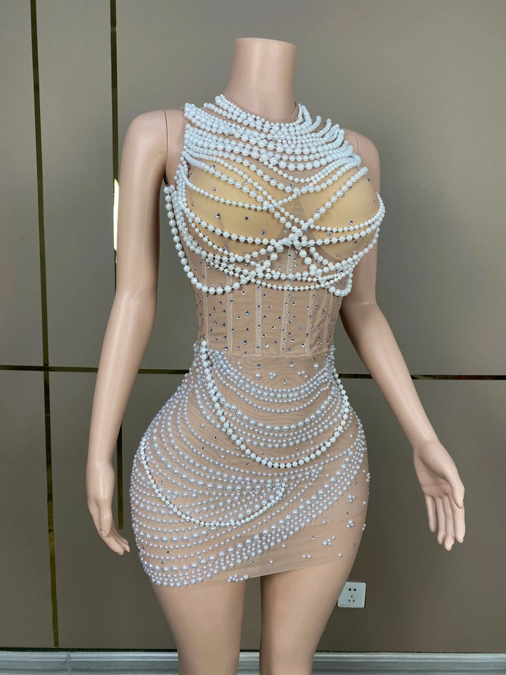 • Pearl & diamond beading → Tiny orbs and crystals glowing like bottled starlight, turning glances into gasps, draping you in irresistible radiance. • Tatted lace weave → Intricate craft that breathes with every sway, gifting textured sensuality. • Medium-stretch fit → Slim X-profile that sculpts without squeeze, promising confident curves. • O-neck & short sleeves → Subtle frame for collarbone and arms, adding sexy club edge. • Natural waist drop → Sheath flow that elongates legs, ensuring effortless allure.