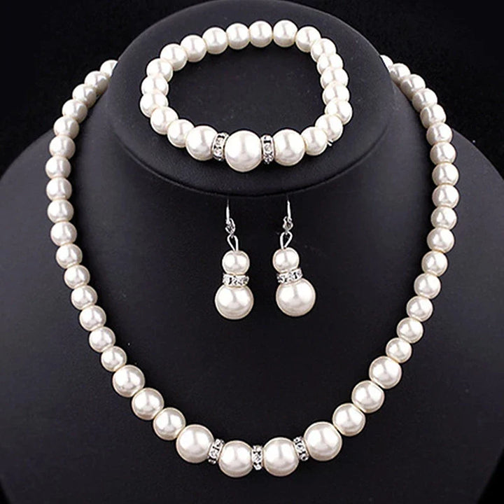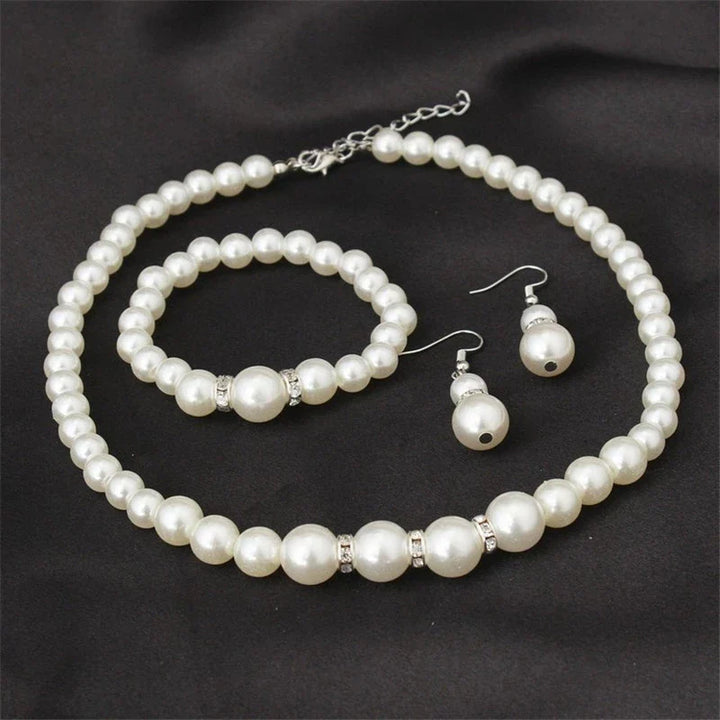 The bonfire’s crackling low, stars spilling overhead, and you reach for another marshmallow—these matching pearls catch the flames in a soft trio, zinc alloy threads glinting like embers, necklace settling at your collar, bracelet kissing your wrist, earrings swaying with every laugh. A gentle clink all around, like wind chimes in the dark. They’re a constellation you wear. Ever think three little pieces could make the whole night orbit you?