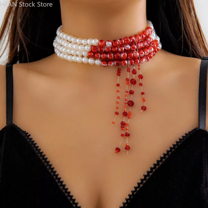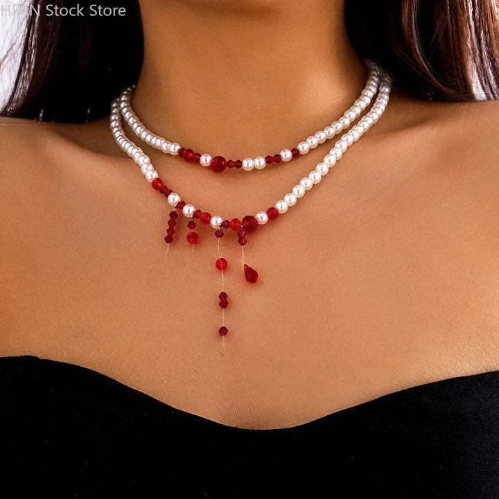 • Blood-stained pearls → Creamy orbs glowing like moonlit gore, turning glances into gasps, draping you in haunting radiance. • Tassel drop cascade → Crimson gems that sway with every breath, gifting dramatic menace. • Zinc snake chain → Tarnish-proof coil in dark silver, promising enduring edge. • Choker silhouette → Breathable band for lace or bare skin, adding intimate terror. • Feather-light build → Barely-there weight for all-night prowl, ensuring comfortable chill.