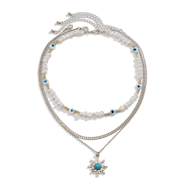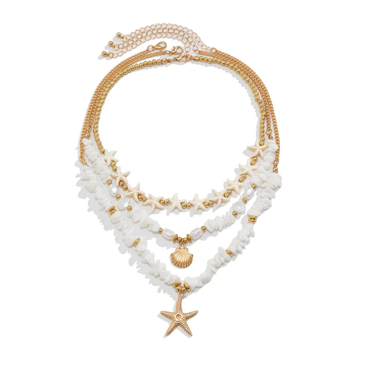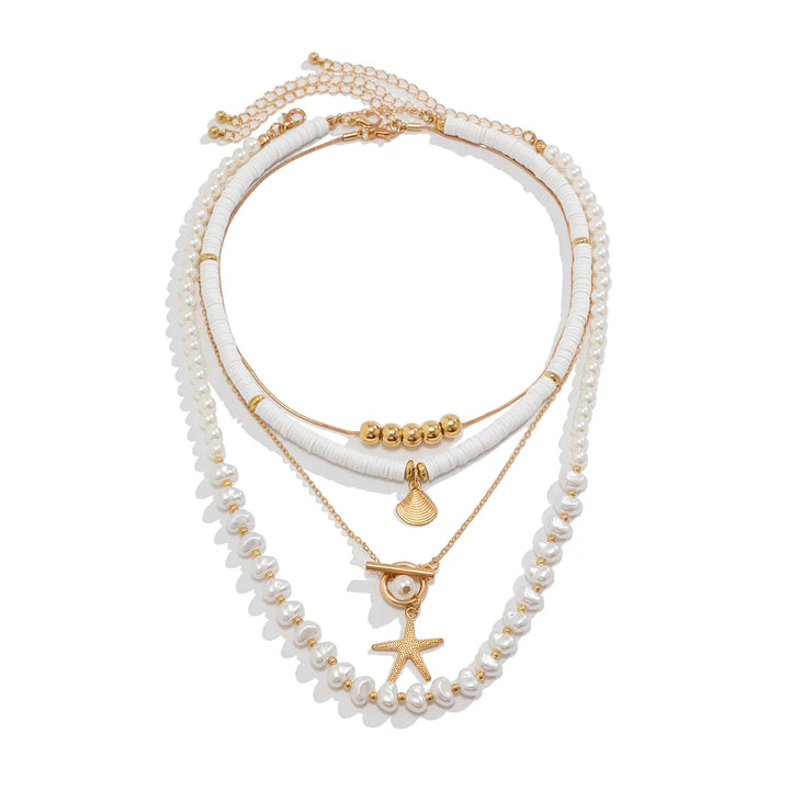 The festival’s pulsing, bonfire crackling wild, and you spin through the crowd—this pearl necklace with gold pendant with star sways like a shooting wish, zinc alloy link chain spilling semi-baroque simulated pearls to a golden star that catches every flame. A soft clink against your chest, cool chain heating fast. It’s sky you can wear. Ever think a pendant could make the whole night orbit you?
