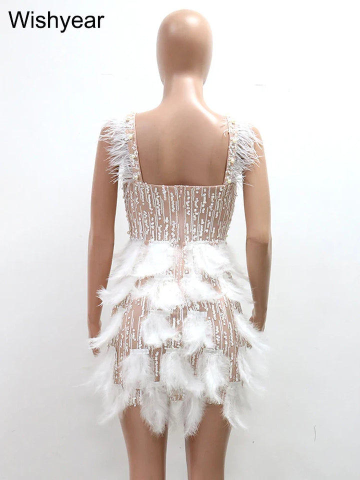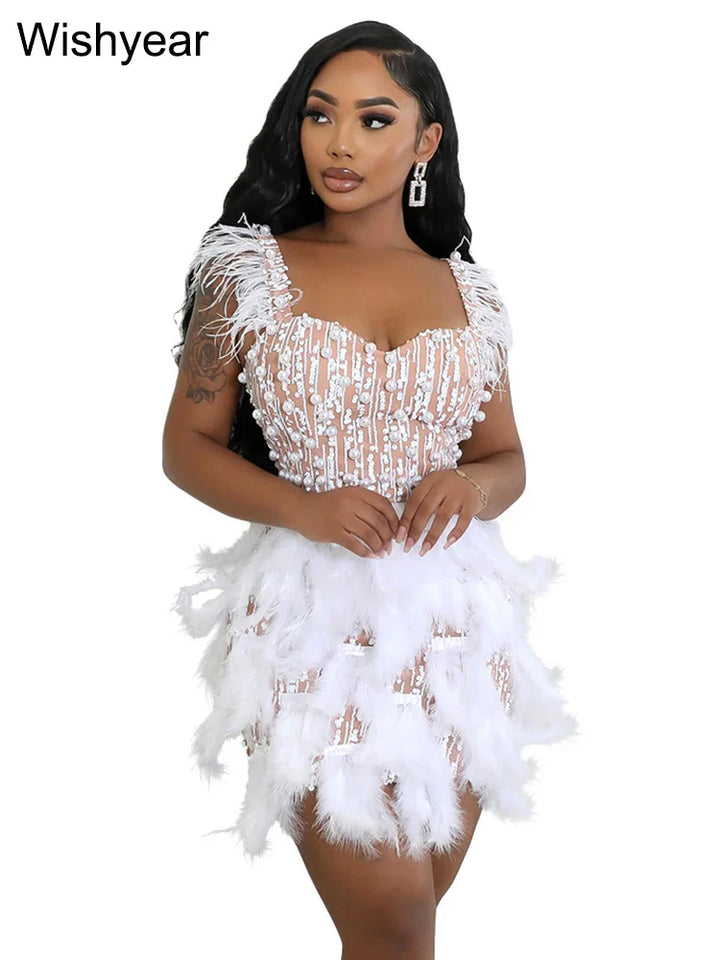 Picture this: golden hour at that rooftop garden party, city lights beginning to twinkle as you step into view. Our Pearl Strap Dress catches the last rays of sunlight, the delicate feathers swaying gently with each movement, creating a dance of shadows against your skin. The V-neckline frames your collarbones perfectly while the A-line silhouette flutters around your thighs, giving you that perfect blend of freedom and femininity. You can feel the medium stretch fabric moving with you, never restricting, always enhancing. Have you ever wondered what it feels like to wear something that doesn't just complement your style but completes it? ✨