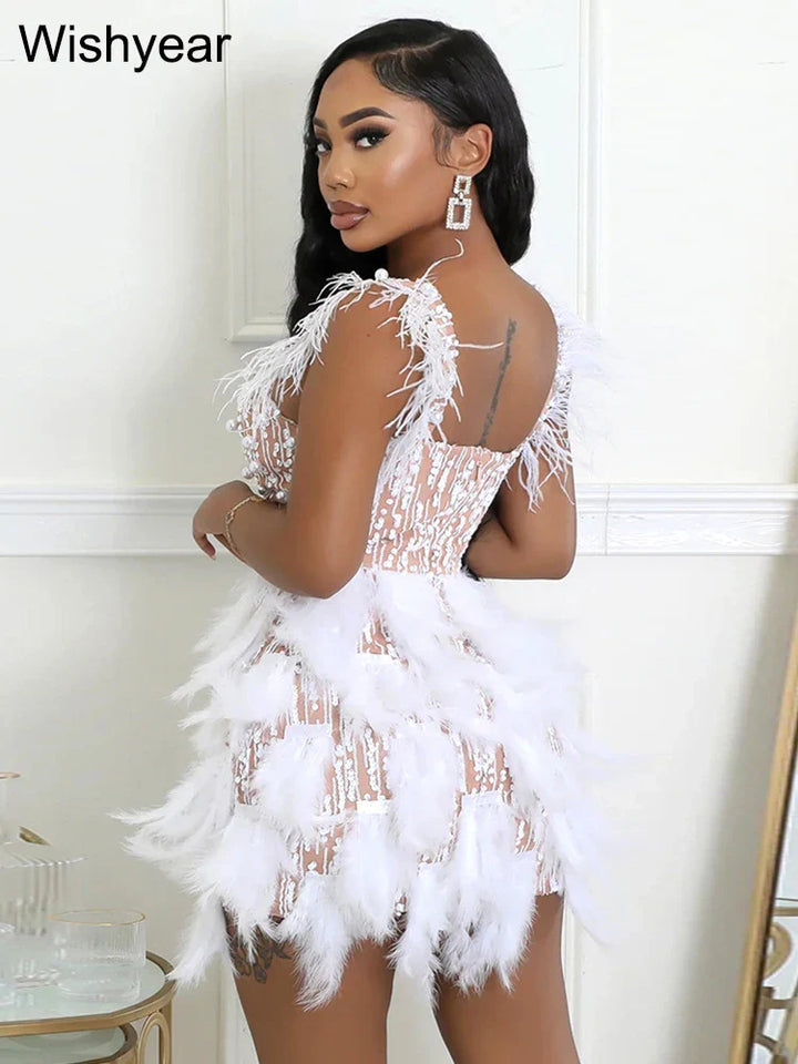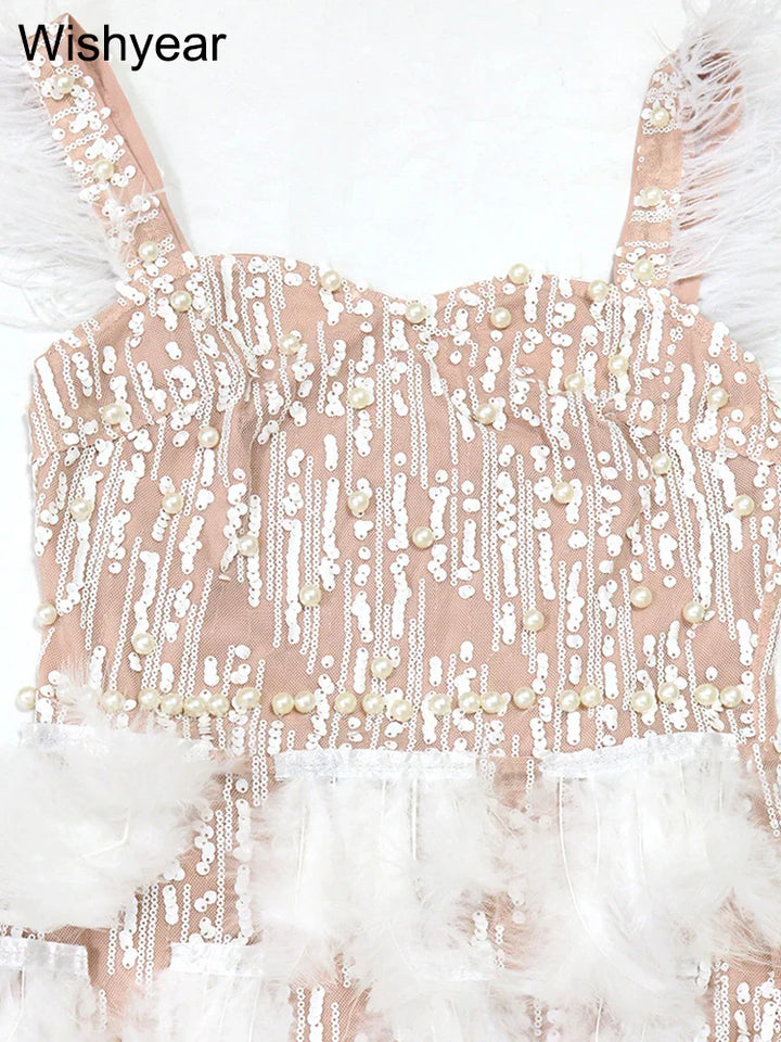 • Delicate feather embellishments → Create movement and texture that catches light beautifully, giving you that irresistible glow • Elegant V-neckline with spaghetti straps
