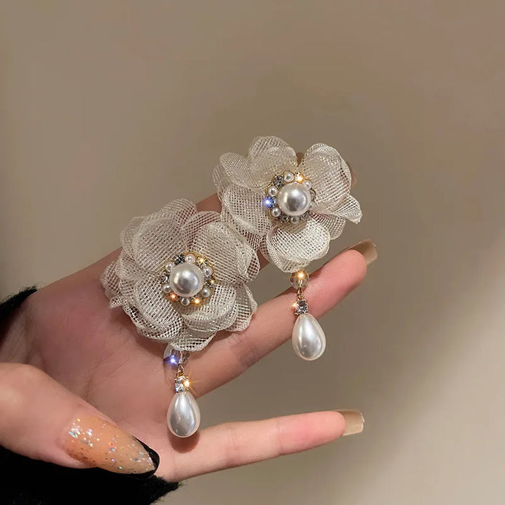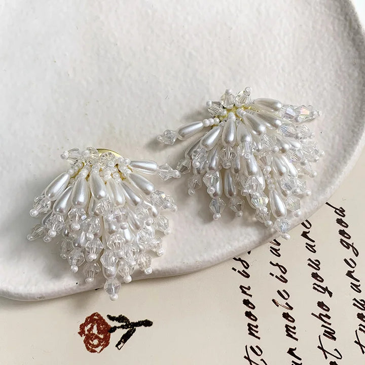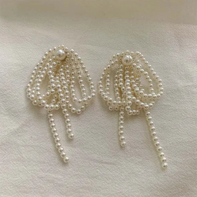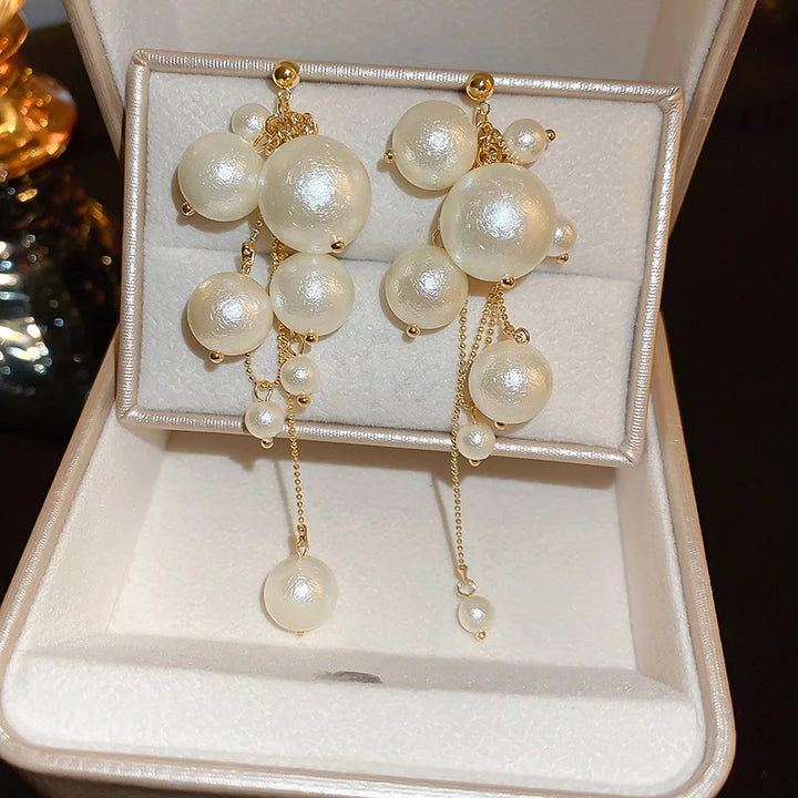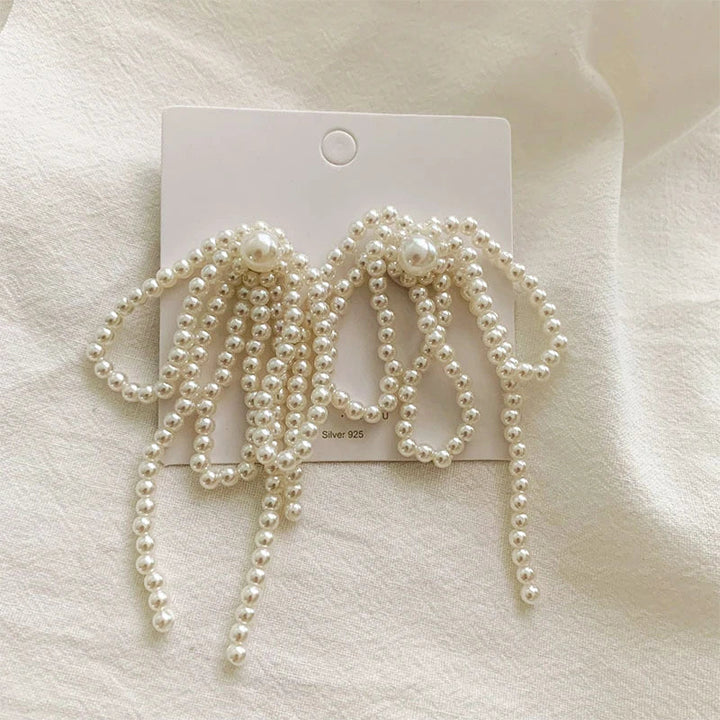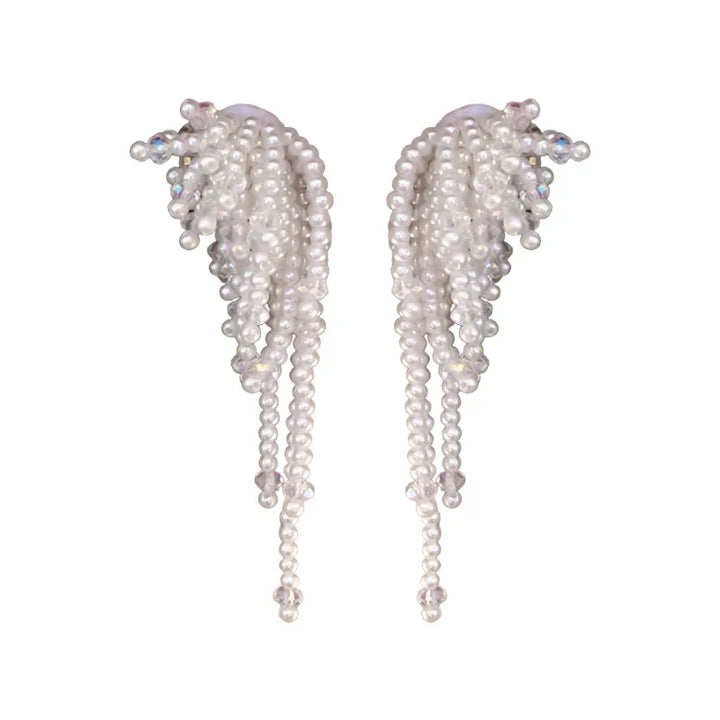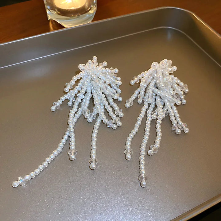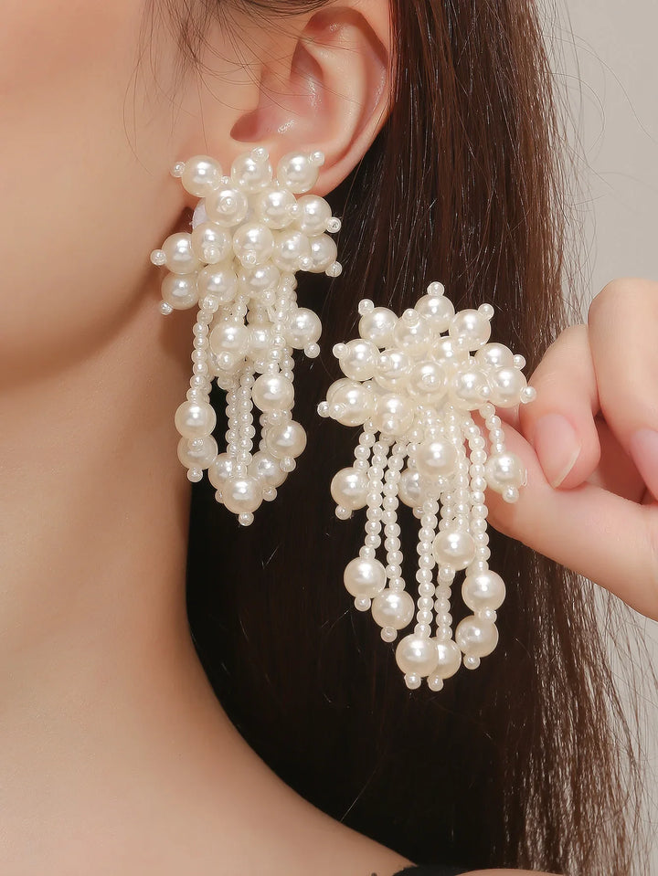 The rooftop garden’s humming, jasmine thick in the air, and you tilt your chin to the breeze—these pearl vines sway like willow branches, simulated pearls dripping in soft tassels, zinc hooks catching the last sun. A gentle clink when you laugh, like wind chimes at golden hour. They’re nature’s whisper on your lobes. Ever think a flick of fringe could make the whole evening bloom?