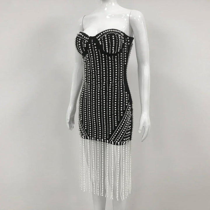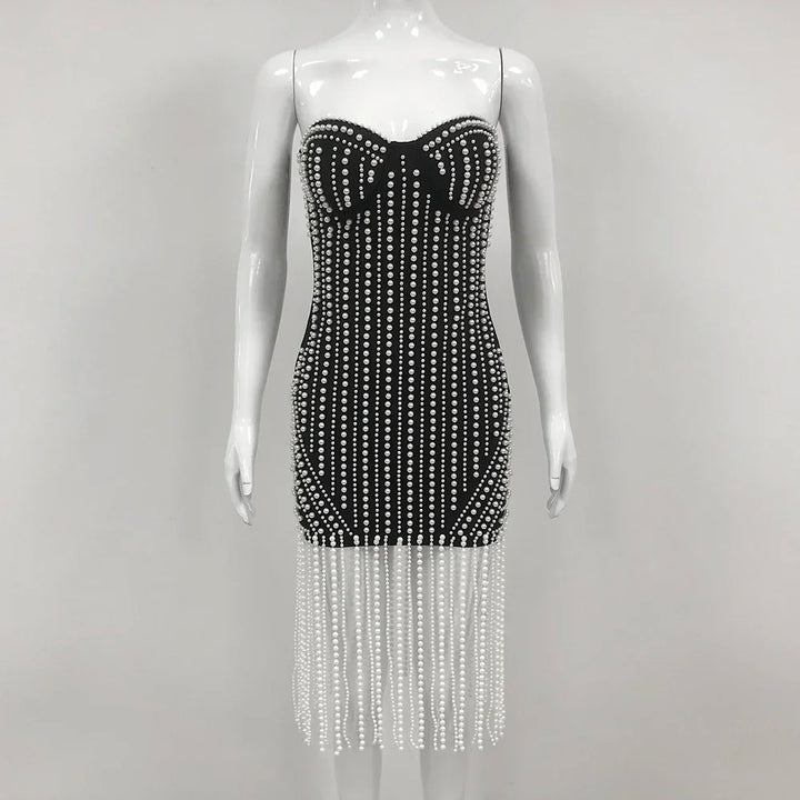 • Delicate pearl embellishments → Catch light from every angle, creating that irresistible glow that makes you the center of attention • Playful tassel detail → Sways with your movements, adding that perfect touch of whimsical charm • High-stretch knit fabric → Moves with you like a second skin, providing all-night comfort without sacrificing style • Above-knee length → Shows just enough leg while maintaining sophistication, offering that perfect flirty-yet-classy balance • Strapless neckline → Highlights your collarbones and shoulders, giving you that effortless elegance • Chest wrapping design → Creates a flattering silhouette that accentuates your natural curves, boosting your body confidence