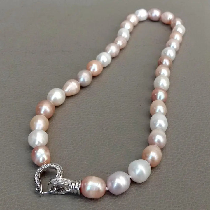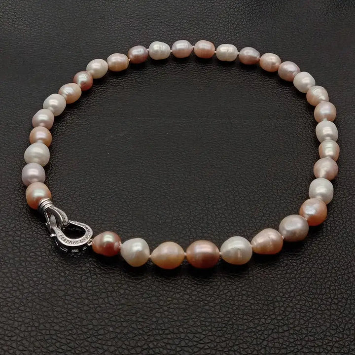 The office terrace is quiet at lunch, skyline shimmering behind glass, and you unclip your hair—this pink and white pearl necklace hugs like a secret blush, tear-drop freshwater pearls (9x12mm) alternating rose and ivory on a 17" strand that ends in an 18k gold-plated CZ lobster clasp. A soft clink against your collar, cool drops warming slow. It’s power with poetry. Ever think blush could make the boardroom feel like it’s whispering you?