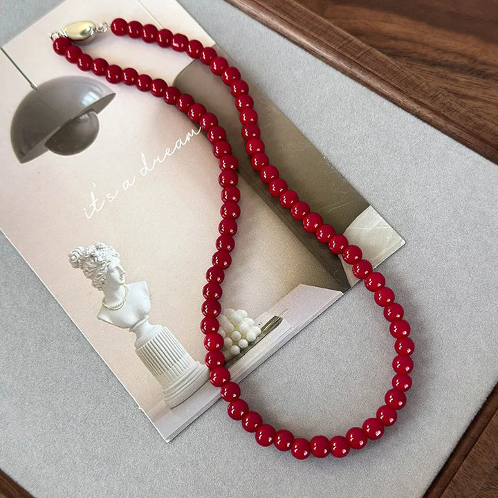 The rooftop garden’s buzzing, string lights tangled in ivy, and you lean over the railing—this red pearl necklace coils like a vine at your throat, copper alloy links laced with simulated ruby pearls in leafy twists, each bead catching the city glow in a warm pulse. A soft clink when you laugh, metal heating to your skin. It’s passion you can wear. Ever think a choker could make the night bloom just for you?