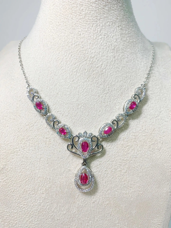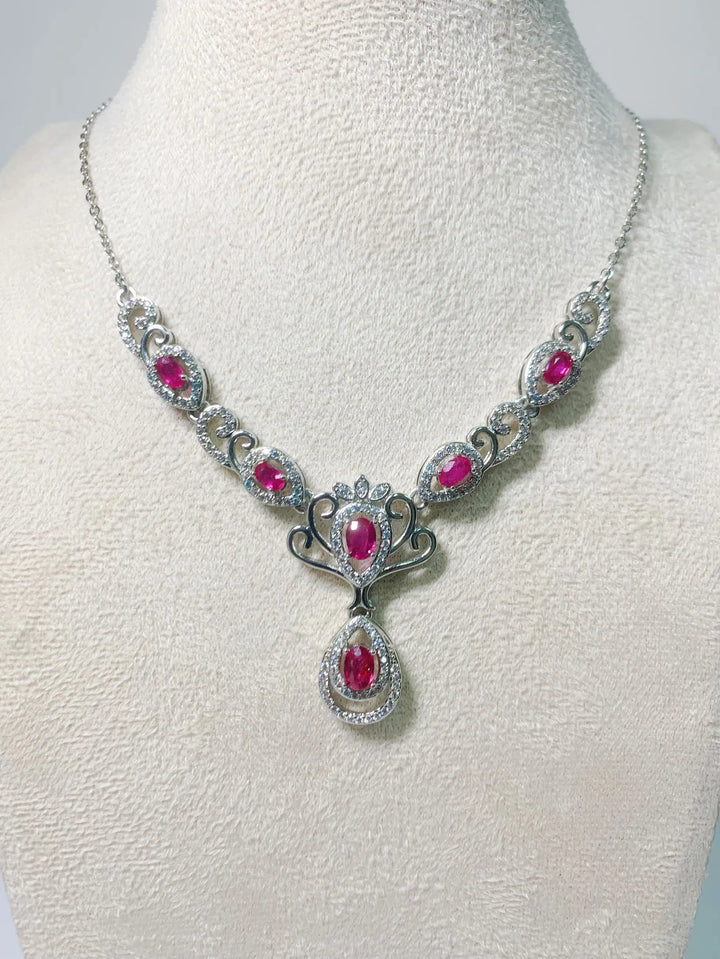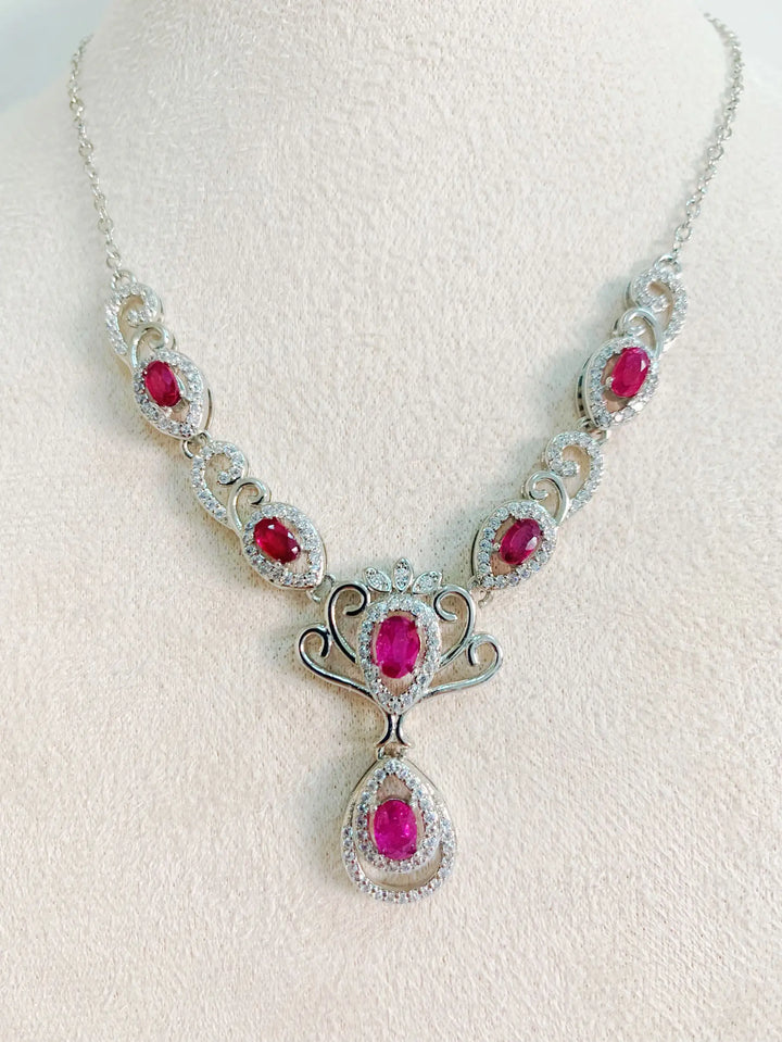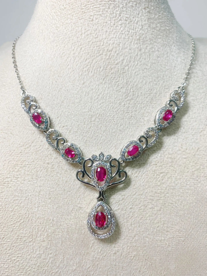 The candlelit ballroom’s hushed, chandeliers dripping gold, and you glide across the parquet—this ruby and pearl necklace hangs like a heartbeat in silver, S925 cradling a natural ruby stone with pearl accents, 4*6mm gem catching every flame while the 50cm chain whispers against your skin. A soft clink when you breathe, ruby warming fast. It’s passion certified. Ever think a pendant could make the whole room pulse in time with you?