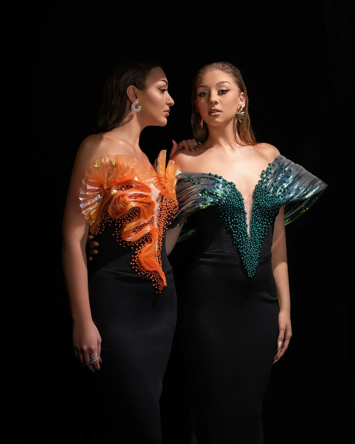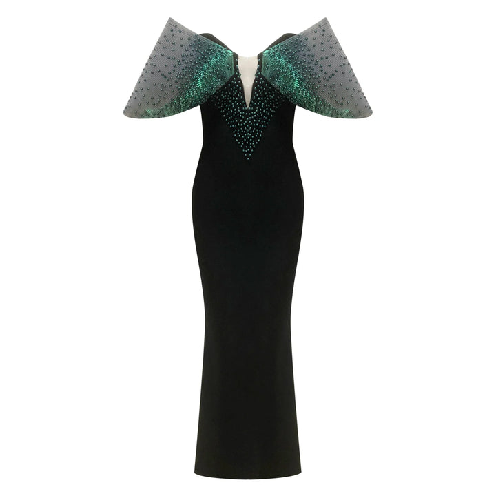 • Delicate pearl beading across the bodice → Creates a luminous effect that catches light from every angle, giving you that irresistible glow • Premium denim blend → Offers structure with just the right amount of stretch, providing comfortable elegance that moves with you • Ankle-length sheath silhouette → Elongates your frame while maintaining sophistication, offering you timeless allure • Strapless design → Highlights your collarbones and shoulders, creating that perfect statement silhouette • Medium stretch fabric → Hugs your curves without restriction, giving you body confidence that lasts all night
