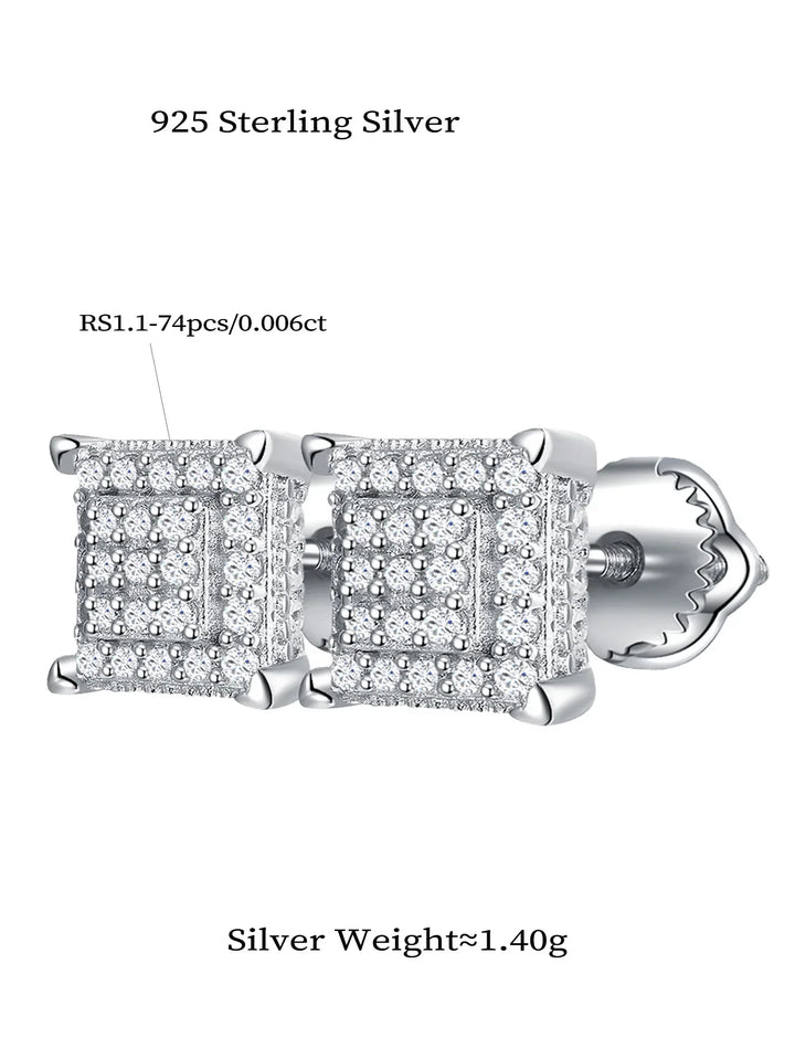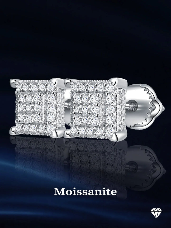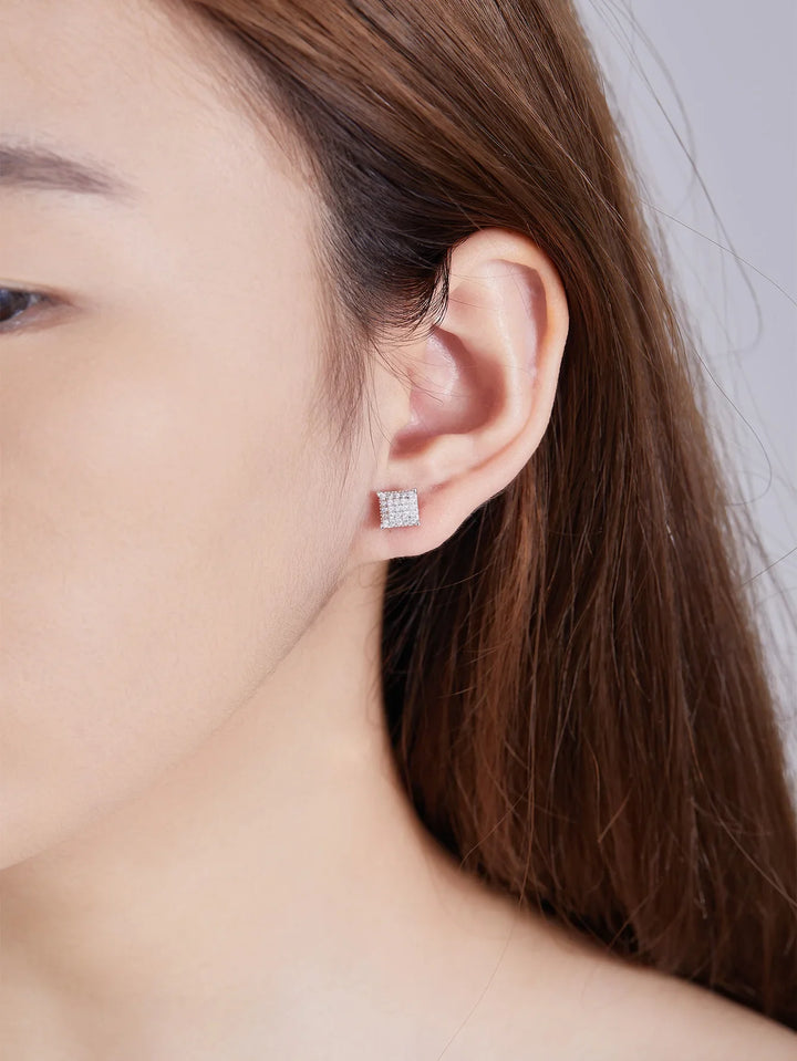 The gallery’s hushed, spotlights soft on white walls, and you tilt your head toward the canvas—these geometric pearls sit crisp like modern art, 925 silver backing the moissanite glow, edges sharp yet feather-light at 1.4g. A quiet click when you smile. They’re architecture for your ears. Ever think a square could make the whole room feel perfectly framed?