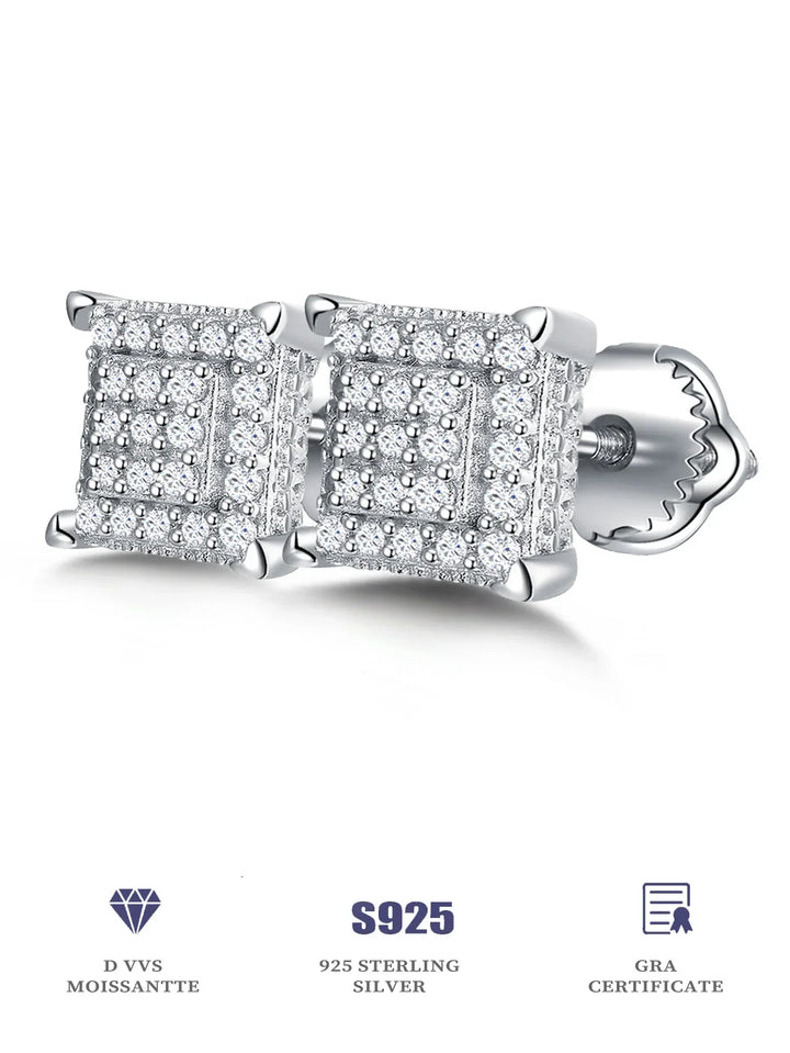 • Moissanite-centered squares → Lab-cut brilliance in pearl-white, catching light like gallery beams, draping you in geometric radiance. • 925 sterling silver posts → Certified pure, hypoallergenic clasp that stays invisible, gifting all-day precision. • Classic fine silhouette → Clean lines for stacking or solo, promising timeless edge. • Third-party appraised → Guaranteed sparkle, no guesswork, adding confident luxe.